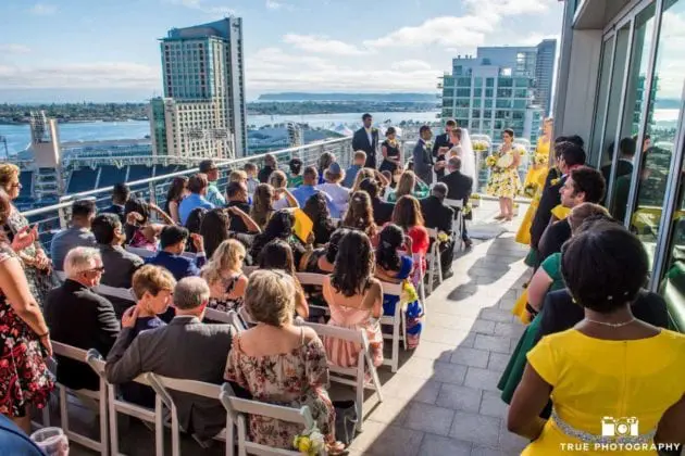 The view from the patio deck has a 270-degree view of downtown and out towards the bay from Coronado Island to Point Loma.