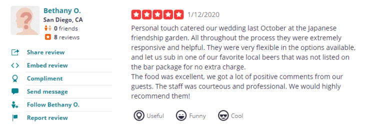 Her glowing event review below helped our team of hard-working staff know they did a stellar job!