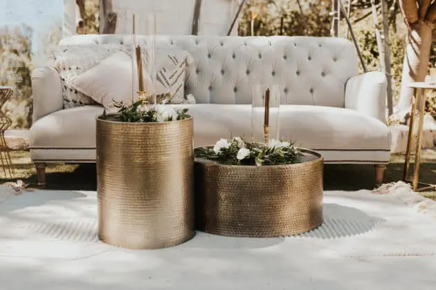 For a Springtime event, we love to see gorgeous vintage and retro sets. Go for more of whichever follows your general aesthetic to help set the tone for a beautiful Spring inspired wedding. Throw in some fun statement pieces, like these metallic side tables, or layers of beautiful rugs to create your unique space.